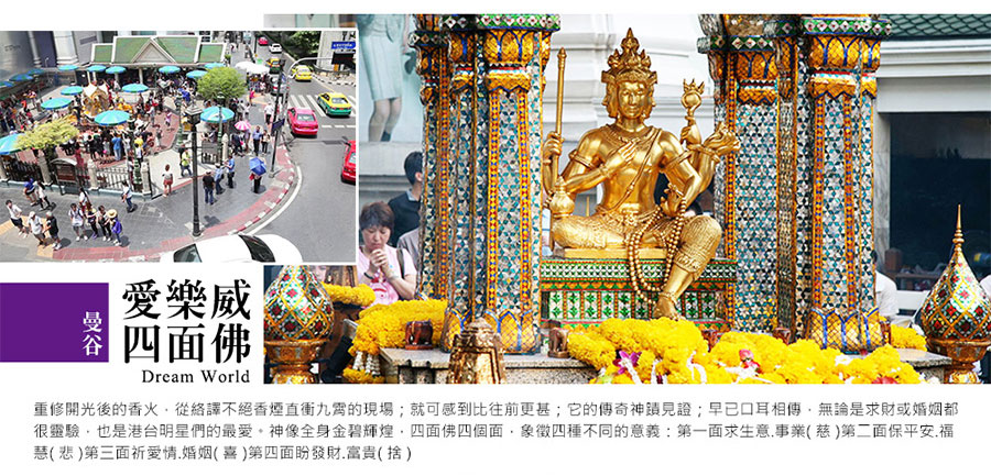 【愛樂威四面佛】無論求財或婚姻很靈驗,也是港台明星們的最愛喔!首先來到一旁的櫃檯買香柱及花環,一份只要20泰銖,內有有3x4=12柱香、四個小花環、一根小蠟燭,點好香後,然後從正面的佛像開始順時針參拜,一面佛像拜完拿三柱香插上香壇,然後再掛上一個小花環,依序拜完四個,而小蠟燭則是插在特別想祈求的那一面的香壇上(例如:背面的姻緣佛像)這樣大概就完成了。