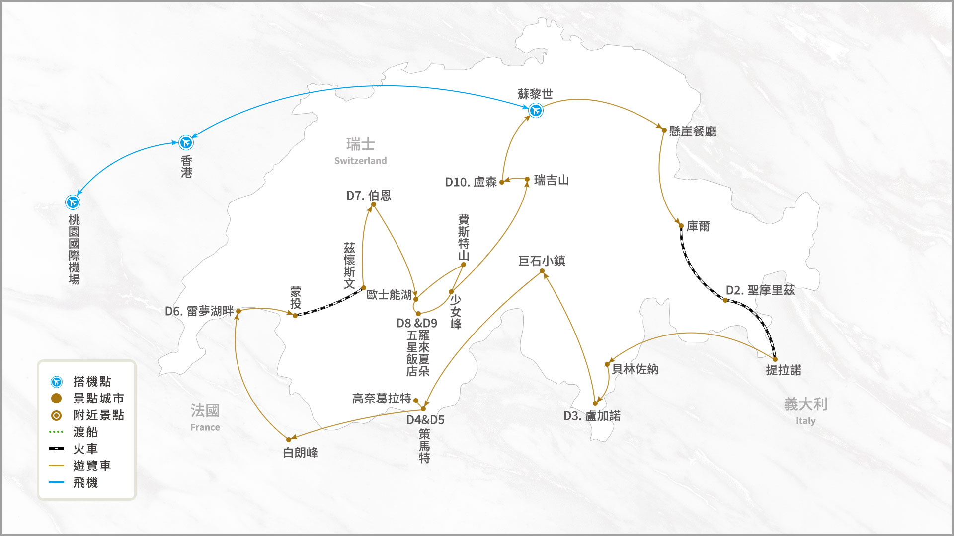 5.特別說明:如遇冰河列車全車預約額滿,將改搭行駛於冰河列車景觀路線之瑞士國鐵列車,敬請了解。